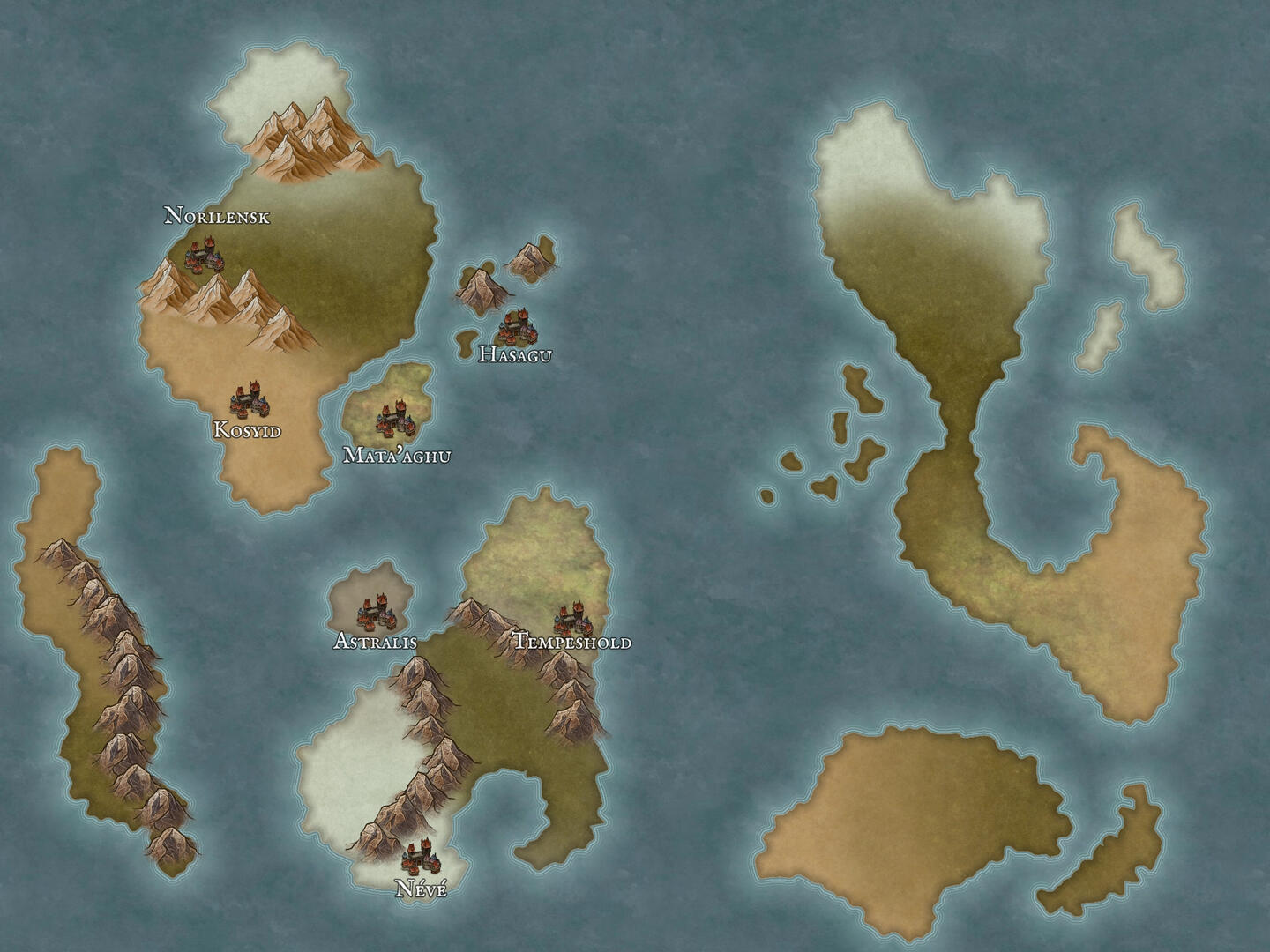 Only at war with Néve because of its proximity, Mata'Aghu is build on the shoulders of artists and craftsmen. Music, literature, theater, and art all once thrived in Mata'Aghu, though the city has been struggling to stay afloat recently.Norilensk